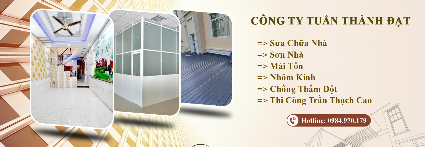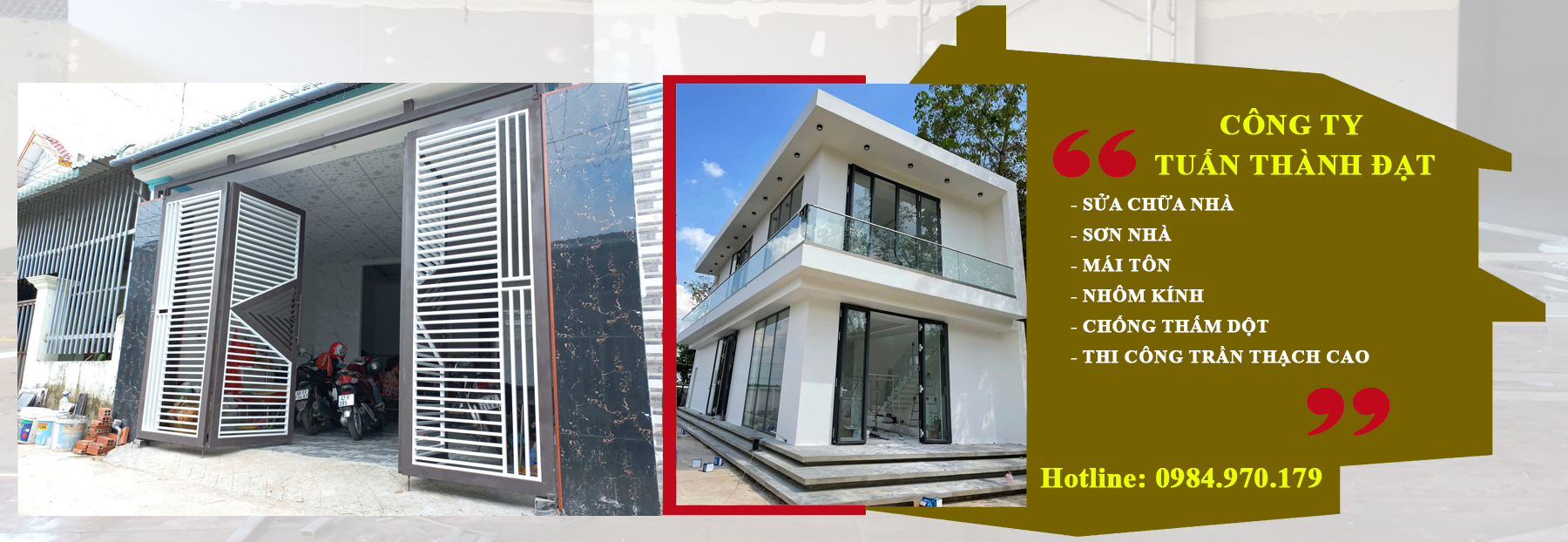 Công ty Tuấn Thành Đạt thi công dự án sửa chữa nhà cho tôi gồm sơn nhà, mái tôn, nhôm kính, chống thấm và trần thạch cao. Đội ngũ làm việc chuyên nghiệp, đúng tiến độ, sản phẩm đẹp và bền. Tôi rất hài lòng, đánh giá Tuấn Thành Đạt uy tín, chất lượng, đáng tin cậy.